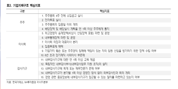 NH투자증권은 “2020년 6월 공시한 171개 기업지배구조 의무공시기업의 핵심지표 준수 점수를 5구간으로 분류한 후, 2020년 10월 KCGS가 발표한 G 및 ESG 등급(S, A+, A, B+, B, C, D 등 7등급)과 비교해 보니 (기업지배구조 핵심지표) 준수 점수 최상위 구간부터 차례로 G 및 ESG 등급 평균이 A+, A, B+, B 순서로 나타났다”고 밝혔다.