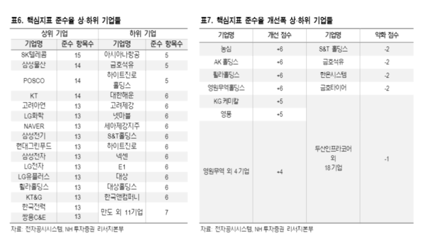개선폭이 가장 큰 기업은 휠라홀딩스와 영원무역홀딩스, SK홀딩스, 농심 등 4개 기업으로 전년대비 6개 항목이 개선됐고 KG케미칼과 영풍 등 2개 기업은 5개 항목에서 개선을 보였다.