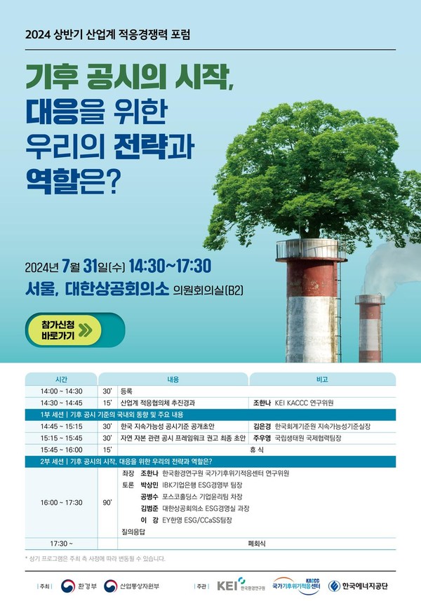 환경부와 산업통상자원부가 오는 31일 '기후 공시의 시작, 대응을 위한 우리의 전략과 역할은?'을 주제로 대한상공회의소 의원회의실에서 '2024 상반기 산업계 적응경쟁력 포럼'을 개최한다.