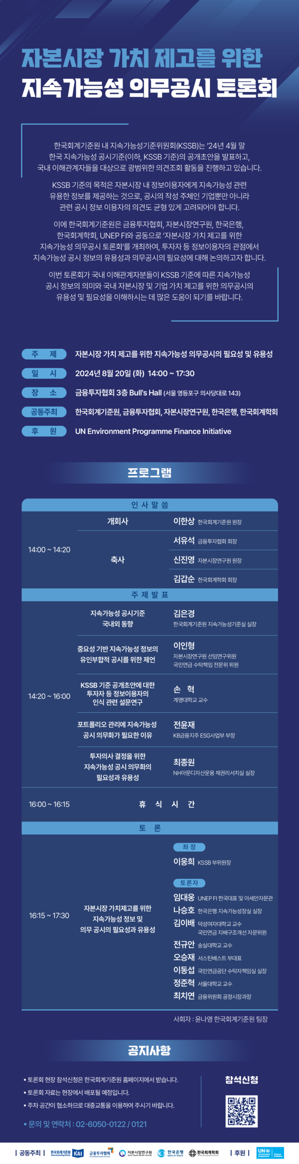 토론회에서는 국민연금 등 기관투자자, 자본시장 연구기관, 통화정책기관, 유엔환경기구, 평가기관, 학계(인증, 법제도 전문가 등), 정부 등 각계 인사를 초청해 자본시장 가치 제고를 위한 지속가능성 의무공시의 유용성과 필요성에 대해 토론을 진행한다.