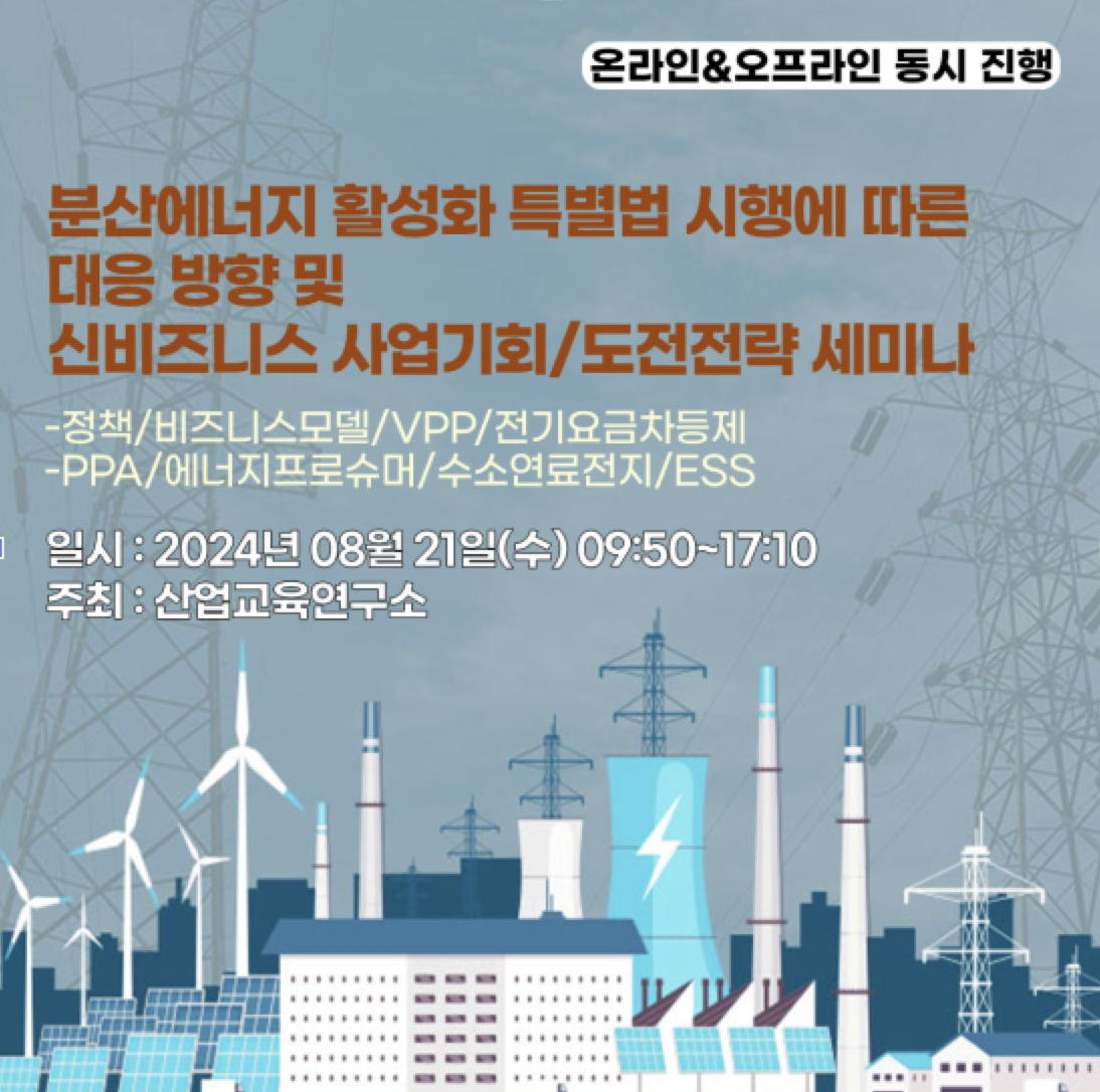 산업교육연구소는 오는 8월 21일(수) 여의도 전경련회관 컨퍼런스센터 2층 토파즈홀에서 '분산에너지 활성화 특별법 시행에 따른 대응방향 및 신비즈니스 사업기회/도전전략 세미나'를 온ㆍ오프라인 동시 개최한다고 밝혔다.