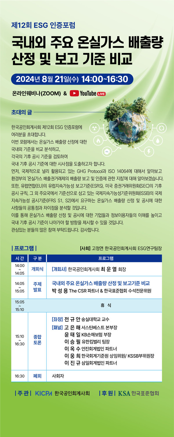 한국공인회계사회는 오는 21일에 ‘제12회 ESG 인증포럼’을 웨비나로 개최한다.