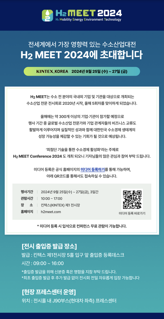 H2 MEET 조직위원회(한국자동차모빌리티산업협회, 한국수소연합, 수소에너지네트워크, 한국에너지공단, 한국산업연합포럼)가 오는 9월 25일부터 27일까지 3일간 <H2 MEET>을 개최한다.