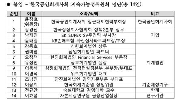 지속가능성위원회는 공인회계사회 윤창호 상근대외협력부회장이 위원장을 맡아 기업, 금융기관, 기준제정기관, 연구기관, 학계, 회계법인 등 광범위한 이해관계자들이 참여한 협의체다. 지속가능성 관련 다양한 분야의 전문가들의 협력을 강화해 지속가능성 공시, 측정, 평가, 인증 등과 관련해 업계 전반을 아우르는 대응 전략을 수립할 예정이다.