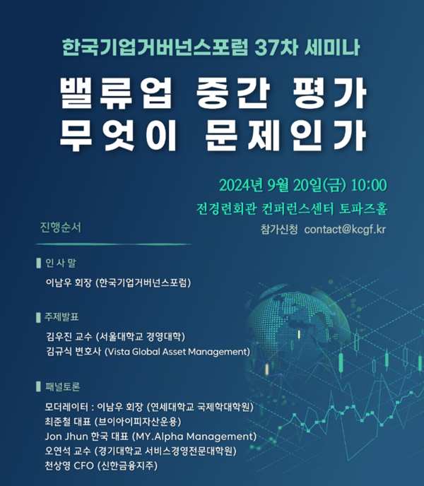 한국기업거버넌스포럼(회장 이남우)는 오는 22일 '밸류업 중간평가, 무엇이 문제인가'라는 주제로 세미나를 개최한다.