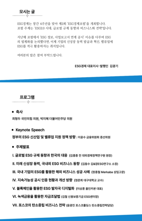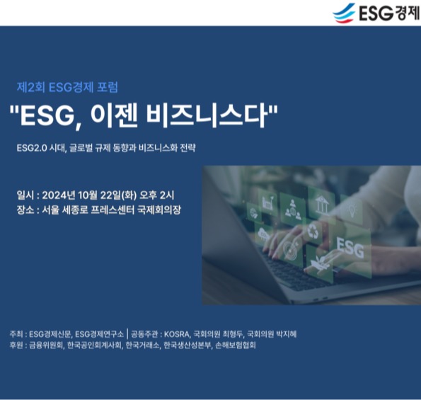 <ESG경제>가 창간 4주년을 맞아 오는 10월 22일 서울 프레스센터에서 'ESG2.0 시대, 글로벌 규제 동향과 비즈니스화 전략'을 주제로 포럼을 개최합니다.