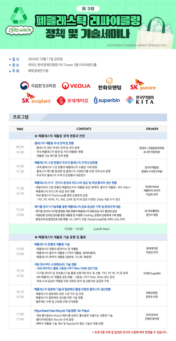 주요 연사로는 국립환경과학원, 베올리아 코리아(Veolia Korea), 롯데케미칼, 한화모멘텀, SK피유코어, SK에코플랜트, 한국무역협회, 수퍼빈 SuperBin 등 플라스틱 전문가들이 참여한다.