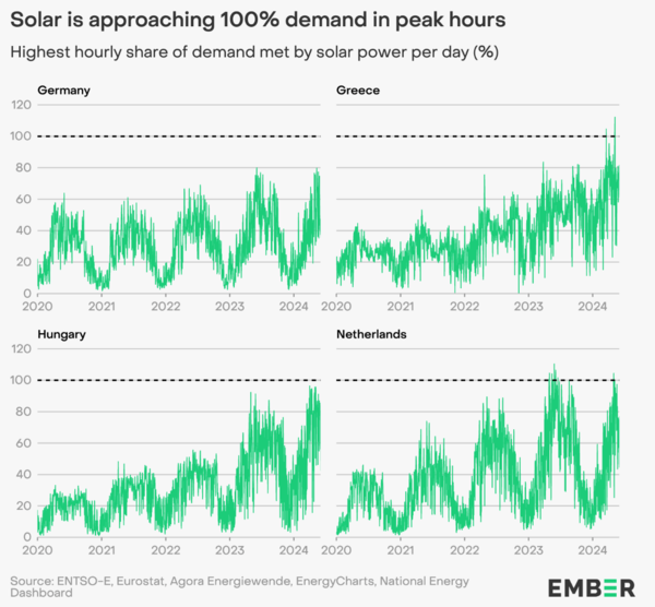 이에 따라 기상 상황에 따라 특정 시간대별 급증하는 재생에너지 발전량을 저장하기 위한 배터리와 전력저장장치의 필요성이 대두되고 있다. 보고서에 따르면 지난 7월까지 1년간 독일, 스페인 등 EU 9개국은 태양광 발전 단독으로 전력 피크시간대 수요의 80% 이상을 충당했다. 그리스와 네덜란드의 특정 시간대엔 태양광 발전량이 수요를 초과하기도 하면서 일부 국가에선 실시간 전력 가격이 마이너스를 기록한 바 있다.