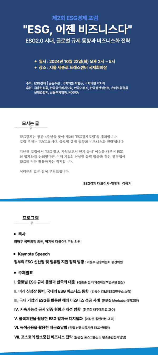 <ESG경제>가 창간 4주년을 맞아 오는 10월 22일 서울 프레스센터에서 'ESG2.0 시대, 글로벌 규제 동향과 비즈니스화 전략'을 주제로 제2회 ESG경제포럼을 개최한다.