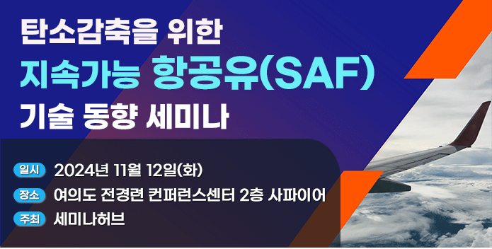 [ESG경제신문=김연지 기자] 세미나허브가 내달 12일 서울 여의도 FKI타워(구. 전경련회관) 컨퍼런스센터 2층 사파이어홀에서 '탄소감축을 위한 지속가능항공유(SAF) 기술동향 세미나'를 개최한다. 지속가능항공유(SAF)란 폐식용유, 폐플라스틱, 산업 폐기물 등을 활용하여 생산한 친환경 대체 연료다.