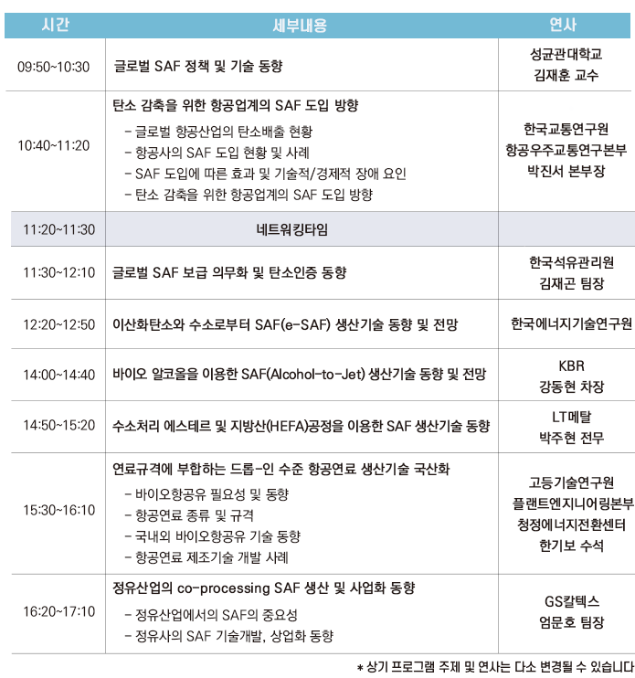 세미나허브 주최로 진행되는 이번 세미나의 오전 세션에서는 △글로벌 SAF 정책 및 기술 동향(성균관대학교) △탄소 감축을 위한 항공업계의 SAF 도입 방향(한국교통연구원) △글로벌 SAF 보급 의무화 및 탄소인증 동향(한국석유관리원) △이산화탄소와 수소로부터 SAF(e-SAF) 생산기술 동향 및 전망(한국에너지기술연구원)에 대해 발표한다.