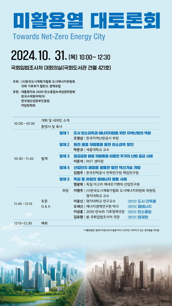 토론회에선 조영삼 한국지역난방공사 부장의 '도시 탄소감축과 에너지자립을 위한 지역난방의 역할', 박문규 세종대 교수의 '원전 폐열 재활용을 통한 탄소감축 방안' 등 전문가들의 발제가 이어진다.
