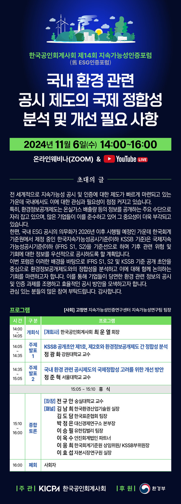 포럼은 정광화 강원대학교 경영·회계학부 교수, 정준혁 서울대학교 법학전문대학원 교수가 주제 발표를 맡아, KSSB 공개초안과 환경정보공개제도 간 정합성을 분석하고 국내 환경 관련 공시제도의 국제정합성 고려를 위한 개선 방안을 모색한다.