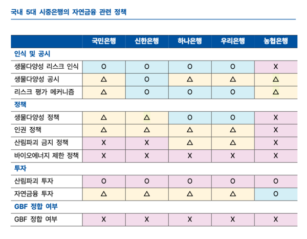 그러나 보고서는 국내 5대 시중은행(국민, 신한, 하나, 우리, 농협) 중 GBF가 권고하는 포괄적인 자연금융 정책을 수립한 은행은 단 한 곳도 없고, 각 은행별로 일부 정책을 제한적으로 도입하는 수준에 그치고 있다고 밝혔다.