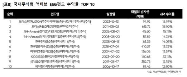 그 외 ‘KCGI ESG동반성장 펀드’가 13% 수익률을 기록해 7위에 오르는 등 투자 전략 중 ‘인게이지먼트’를 주요 전략으로 포함한 ESG 펀드들이 상반기 수익률 상위에 올랐다.