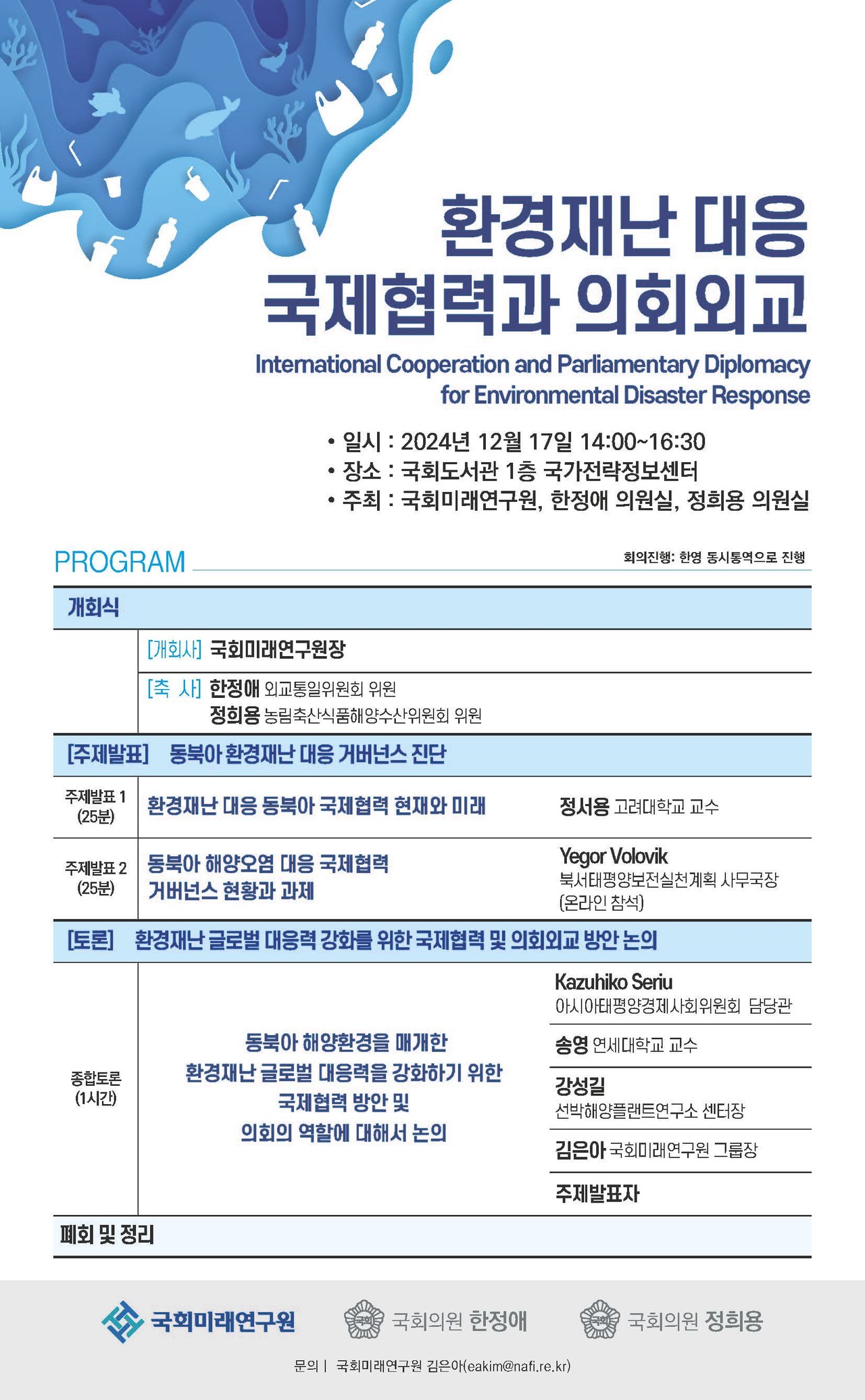[ESG경제신문=김연지 기자] 국회미래연구원과 더불어민주당 한정애 의원(서울 강서구병), 국민의힘 정희용 의원(경북 고령군성주군칠곡군)이 오는 17일 '환경재난 대응 국제협력과 의회외교' 세미나를 개최한다.