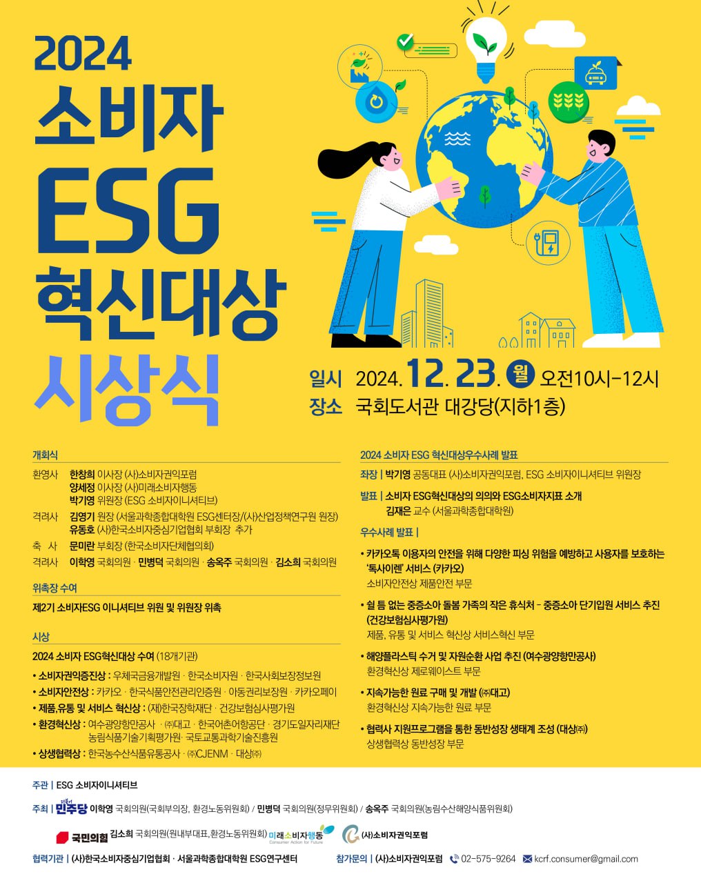 [ESG경제신문=김연지 기자] 소비자권익포럼은 오는 23일 국회도서관 대강당에서 '2024 제2회 소비자 ESG 혁신대상' 우수사례 총 18개 기관 및 사업에 대한 시상식을 개최한다. 이날 행사에서는 향후 소비자의 ESG 참여를 확산시키기 위한 국내 첫 활동 플랫폼으로 'ESG 소비자이니셔티브' 발대식도 진행한다.
