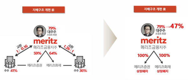 이를 통해 대주주의 지주에 대한 지분율은 79%에서 47%로 감소했으며, 메리츠금융지주는 메리츠증권과 메리츠화재를 완전 자회사로 소유하고 두 자회사는 상장 폐지됐다. 이 과정에서 완전 모회사 체제가 구축되어 중복 상장으로 인한 디스카운트 문제가 해소되었고, 선진적인 지배구조로 전환이 이뤄졌다.