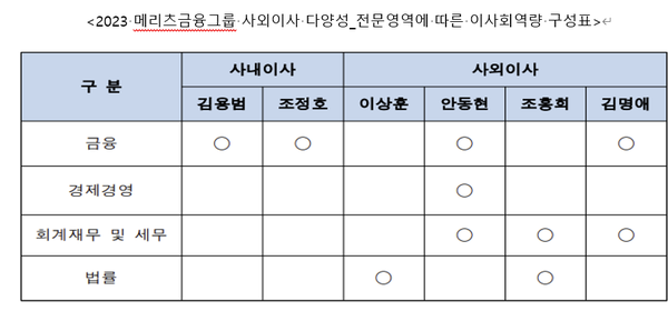 또 글로벌 기준에 맞춰 이사회의 독립성과 다양성도 확대해 나가야 한다. 현재 메리츠금융그룹은 이사회 의장과 대표이사가 겸직 상태다. 이 때문에 금융당국으로부터 경영진 견제 미흡 등 이사회 역할 부실 지적과 제재를 받은 바 있다. 현재 이사회 구성원의 전문분야가 금융, 경제에 집중 되어 있고, 여성 사외이사가 한 명에 그쳐 다양성 측면에서도 개선의 여지가 있다.