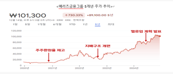 26일 금융업계에 따르면 메리츠금융그룹이 강력한 주주환원 정책과 지배구조 개편을 통해 국내 금융주 가운데 가장 높은 주가 상승률을 기록한 것으로 나타났다. 최근 5년간 주가 상승률은 무려 730%에 달한다.