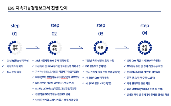 이어 "ESG E부분 평가점수를 높이기 위해 목표를 설정하고 ESG경영 활동을 한 것은 부인하지 않지만 결과적으로 ISO 14001(환경경영시스템) 및 ISO 45001(안전보건경영시스템) 동시 인증 획득과 2024년 지속가능경영보고서 발간, 2024년 ESG심사평가 결과(A)는 대단한 성과라고 자부한다"고 덧붙였다.