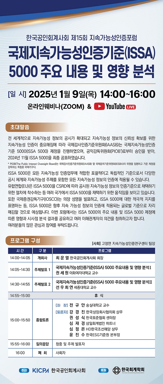 이번 포럼은 국제감사인증기준위원회(IAASB)가 지난해 11월 발표한 ‘국제지속가능성인증기준(ISSA) 5000’의 주요 내용 및 영향 분석을 주제로 열린다.