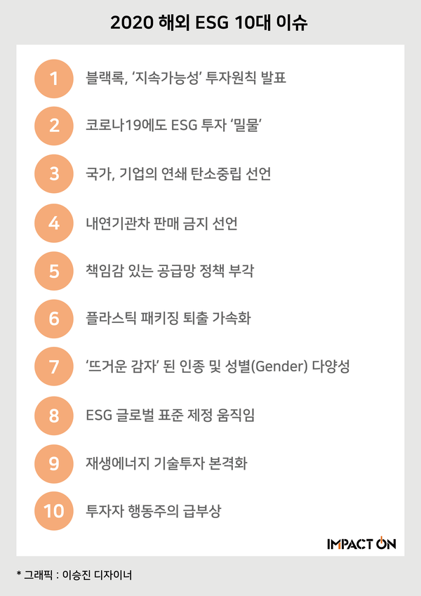 2020년을 보내며 ESG 관련 해외 10대 뉴스를 소개한다. 10대 뉴스는 데이터 기반 사회책임경영 전문 미디어인 인팩트온이 선정했다. [ESG경제]